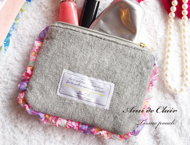 Ami de Clairアミドゥクレールのティッシュポーチ グレーです。水彩風花柄のシフォンフリルの縁取りが素敵。さり気なく毎日もちたいティッシュケース。ささっと取り出したティッシュケースまでカワイイと女子力アップ間違いなし♪ファスナー付ポーチにはハンドクリームやグロスなどの小物はもちろん、カード類を収納するのにも適しています。外地は柔らかく肌触りのよいベロア素材を採用。内側は光沢のあるサテン地で高級感を演出しています。ご友人やご家族、恋人など女性への贈り物にも最適です。