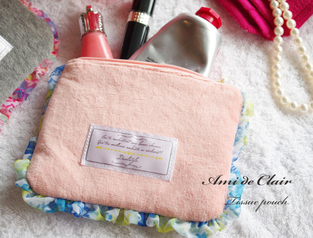 Ami de Clairアミドゥクレールのティッシュポーチ ピンクです。水彩風花柄のシフォンフリルの縁取りが素敵。さり気なく毎日もちたいティッシュケース。ささっと取り出したティッシュケースまでカワイイと女子力アップ間違いなし♪ファスナー付ポーチにはハンドクリームやグロスなどの小物はもちろん、カード類を収納するのにも適しています。外地は柔らかく肌触りのよいベロア素材を採用。内側は光沢のあるサテン地で高級感を演出しています。ご友人やご家族、恋人など女性への贈り物にも最適です。