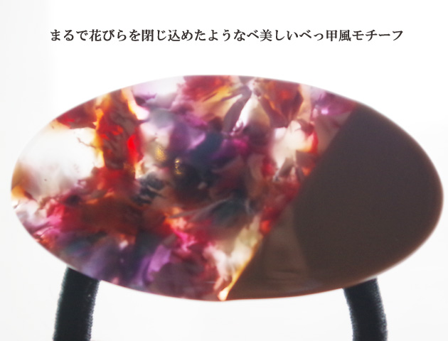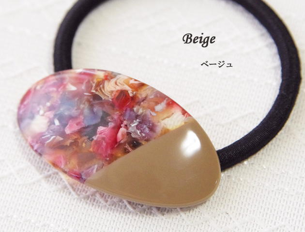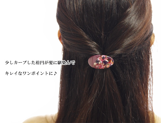 まるで花びらを閉じ込めたようなべっ甲柄楕円モチーフがとても美しいヘアゴム。楕円モチーフは少しカーブしているので髪に沿うように馴染みます。べっ甲柄では珍しいキレイ色がミックスされたタイプなので、結ぶだけで華やかなワンポイントに♪お団子ヘアや髪を結んでからくるっとねじる、くるりんぱヘアにもおすすめ!オフィスシーンやカジュアルシーンなど、場面を選ばず毎日活躍してくれます。全3カラーよりお選びいただけます。
