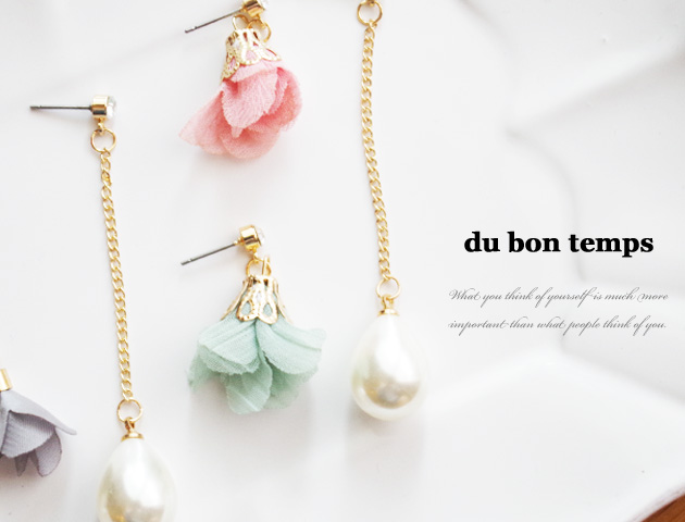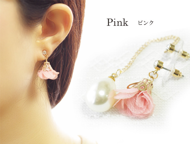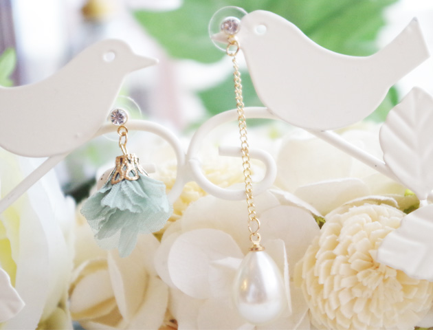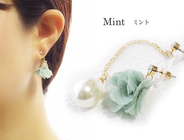 レースのお花モチーフと大粒のしずく型パールロングピアス。左右で違うモチーフを楽しむアシンメトリータイプ。おしゃれ度がぐんとアップすること間違いなしのピアスです。大粒のしずく型パールは耳元で艶やかに揺れて小顔効果も♪もう一方のレースのお花モチーフはふんわりとした印象で女性らしさUP。パーティーなどの華やかなシーンにもおすすめです。ピンクとミントの2カラーよりお選びいただけます。