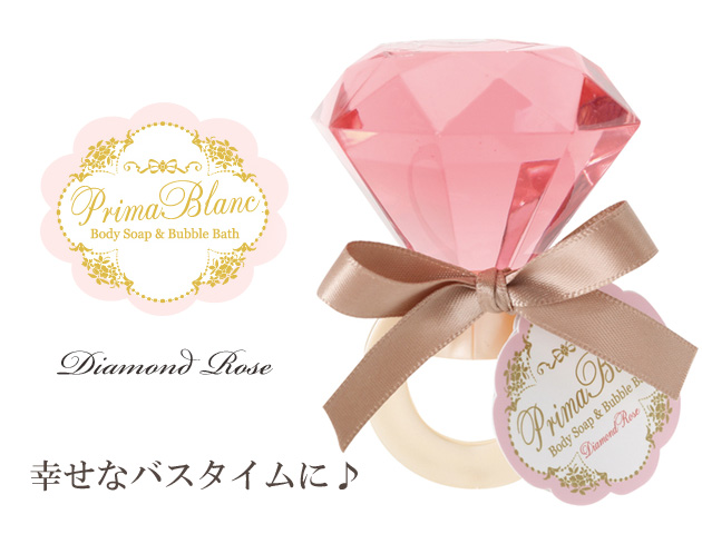 女の子が憧れる幸せモチーフ、大きな「ダイヤモンドリング」をモチーフにしたバスジェルです。ボディーソープやバブルバスとしてもご利用いただけます。リボンが付いているのでラッピングなしでもお渡しいただけます。結婚式などのプチギフトやちょっとしたお返しにおすすめです。