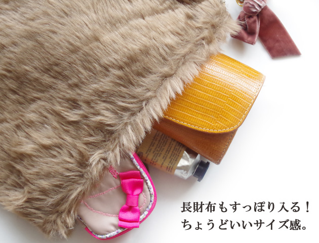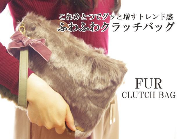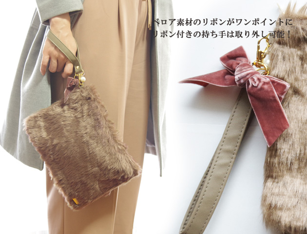 季節感がグッと増す!もこもこファーのクラッチバッグ。こちらのバンビ柄はふんわりと優しい印象。普段は取り入れずらいアニマル柄もこちらのバンビ柄なら控えめで合わせやすい♪カジュアルもシンプルもガーリーも、、どんなコーデにも相性抜群のファークラッチバッグ。ずっと触っていたくなるファーの素材感が◎。大きすぎないサイズ感は主張しすぎず大人っぽい印象。長財布もすっぽり入ります!持ち手付きで持ち運びしやすいのも嬉しいポイント。さらにこの持ち手は取り外しも可能!おおきめのトラベルポーチとしても使えます。ベルベットリボンも付いてクールさに少しだけ甘さをミックス。普段使いはもちろん、パーティーシーンにもおすすめのバッグです。
