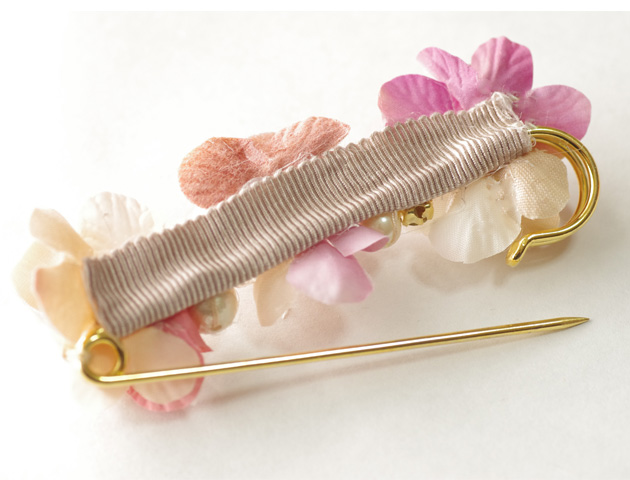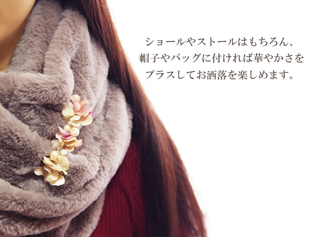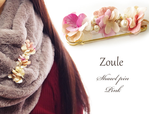 花びらを重ねたグラデーションが美しい「zouleゾーラ」のショールピン(ストールピン)。ショールやストールにはもちろん、スヌードや帽子・バッグなどに着けてワンポイントのおしゃれを楽しめます♪シンプルになりがちなスタイルの差し色に持ってっこいのアイテムです。花びらだけでなく、コットンパールやビジューが顔をだしてエレガントさもプラス。お花だけど可愛くなり過ぎず、大人の女性におすすめのファッションアイテムです。