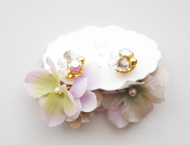 美しいグラデーションのお花が重なり、まるで小さなブーケのようなバックキャッチピアス。耳の後ろからお花が覗いてどの角度から見てもかわいい!トップにはビジューが上品にあしらわれて煌めきをプラス。お顔周りを華やかに演出してくれます。暗くなりがちなコーディネートの差し色にもってこいのアイテムです。普段使いはもちろんパーティースタイルにもおすすめ。特に髪をアップにするときは後ろからお花モチーフが見えるのでとっても素敵です。お花モチーフとトップを前後逆に着ければまた違う雰囲気もお楽しみいただけます。