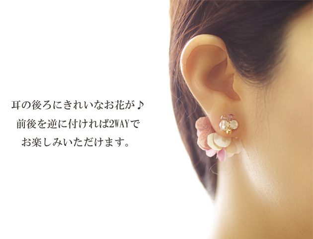 美しいグラデーションのお花が重なり、まるで小さなブーケのようなバックキャッチピアス。耳の後ろからお花が覗いてどの角度から見てもかわいい!トップにはビジューが上品にあしらわれて煌めきをプラス。お顔周りを華やかに演出してくれます。暗くなりがちなコーディネートの差し色にもってこいのアイテムです。普段使いはもちろんパーティースタイルにもおすすめ。特に髪をアップにするときは後ろからお花モチーフが見えるのでとっても素敵です。お花モチーフとトップを前後逆に着ければまた違う雰囲気もお楽しみいただけます。