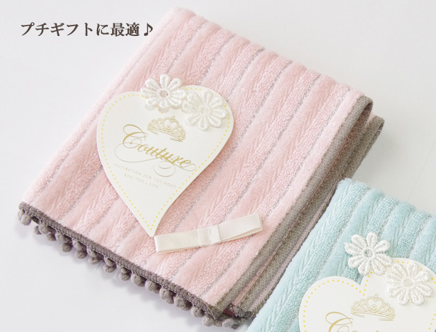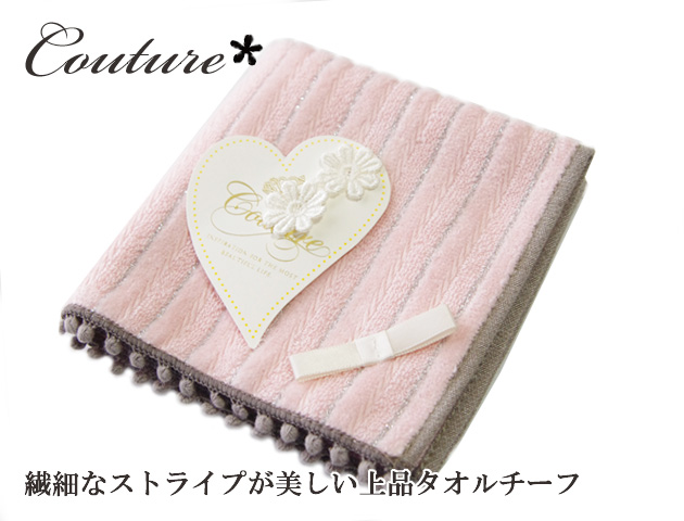 スウィートな雰囲気ときれいな色味が素敵なクチュールノーブルラインのタオルハンカチ ピンクです。小さなボンボンでふちどられ、さらにリボンがあしらわれた可愛らしいデザイン。折り方の違いよってできる繊細なストライプが美しいタオルハンカチはちょっとしたお礼やプチギフトにもおすすめ。控えめなデザインなので結婚式など特別なシーンにも使える女性らしい素敵なタオルチーフです。