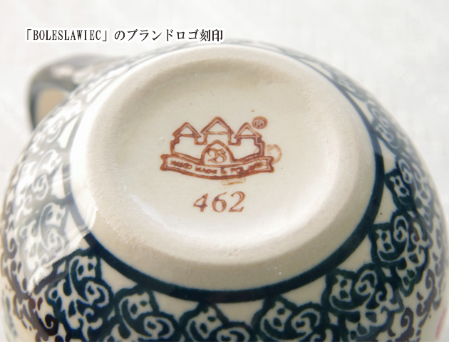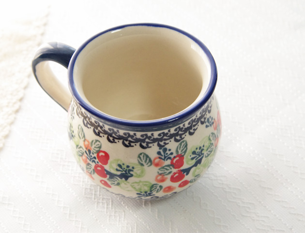 温かみを感じるポーリッシュポタリーのマグカップがポーランドから届きました。こちらのマグカップは飲み口の部分がくびれたポーリッシュポタリー独特のフォルム。丸みのあるぷっくりとしたたたずまいに癒されます。ひとつあるだけでテーブルが華やかになり気持ちまで楽しくなっちゃう♪赤い木の実が描かれた可愛らしいデザイン。このマグカップは「Zaktady Ceramiczne BOLESLAWIEC(ザクワディ ツェラミチネ ボレスワヴィエツ)」という最も伝統のある信頼の厚い製造元でつくられたものです。マグカップの裏側に押されたスタンプがその証です。ペアにして誕生日プレゼントや結婚祝い、お引越し祝いの贈り物にも最適です。
