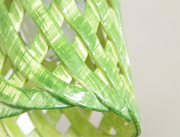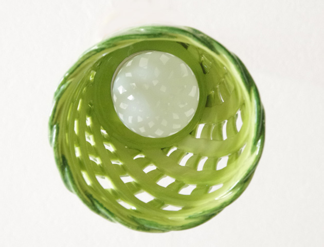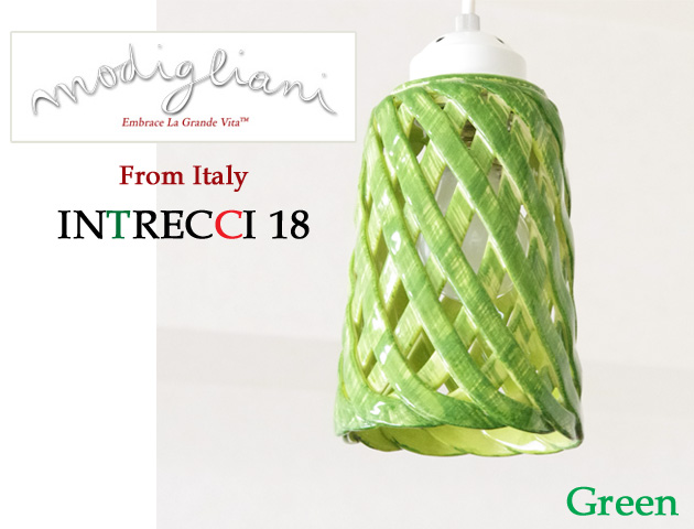 圧倒的な存在感を放つペンダントライト。繊細なデザインが印象的な「INTLAMPC/18」グリーン(緑)です。イタリアの老舗陶器メーカーModiglianiモディリアーニの高い技術で仕上げた網目状のシェードから光がこぼれます。陶器の温かい雰囲気が心地よい空間を演出してくれます。優しい雰囲気のグリーンは観葉植物の緑と合うので意外としっくり落ち着いた雰囲気にまとまります。おしゃれな雰囲気づくりをお手伝いします。ダイニングテーブル上のペンダントライトなどにおすすめです。とても珍しい陶器の網目状シェードは末永くお使いいただけるとても素敵なデザインです。コードやソケット部分は日本製のものをお付けしていますので安心してお使い頂けます。取り付けは簡単な引掛けシーリング式です。