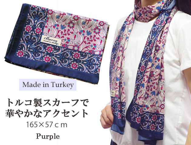 カーネーションやチューリップなどのトルコの人気柄がデザインされたエレガントなロングスカーフのパープルです。今人気のスカーフはコーディネートに取り入れると一気に華やかになります。素材は光沢がありサラッとしたシルクのような肌触り。シルクはシワになりやすくお手入れが大変ですが、こちらは結んだりしてもシワになりにくいのも嬉しいポイント!エキゾチックなトルコ柄は普通の総柄とは違いお洒落度もワンランクアップ♪通常のスカーフ使いはもちろんバッグに着けてワンポイントにしたり、バンダナにしてみたり♪さらに、ロングタイプだからベルトのように使ったり、肩にかけてストールのように使うこともできちゃう優れものです。カーネーションがデザインされているので母の日の贈り物にも喜ばれます♪