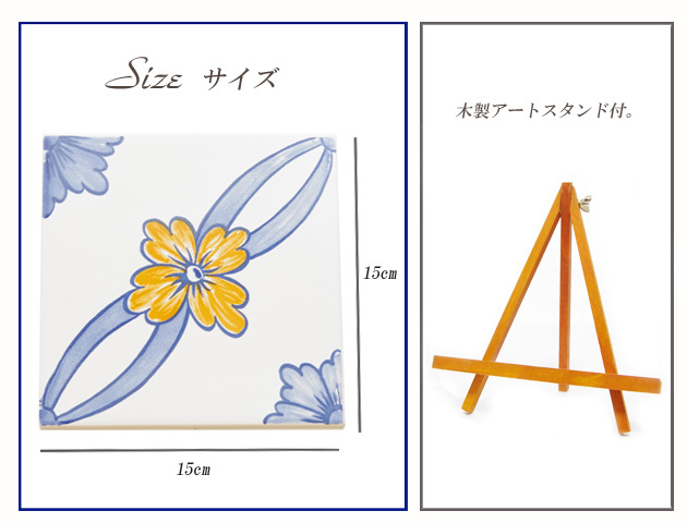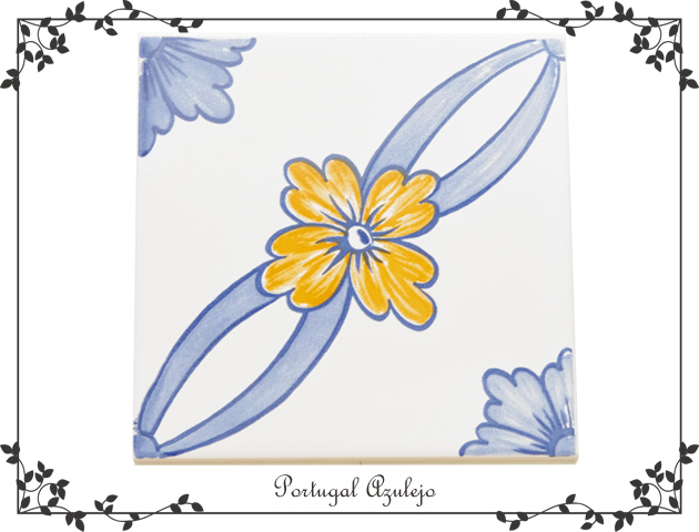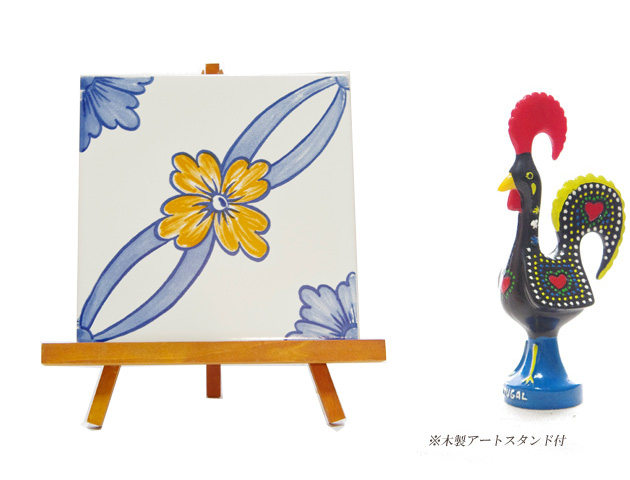ポルトガルではタイルのことを「アズレージョ」と呼び古くから人々の生活にとても身近なものとして親しまれています。そんなポルトガルの絵タイルでできた鍋敷きです。こちらのタイルは華やかな黄色いお花が描かれています。黄色とブルーのバランスが絶妙で素敵です。裏面にはコルク材がついてテーブルなどを傷つけにくくなっています。また、アートスタンドもセットになっているので、使わないときはアートの様にスタンドにセットして飾ることもできます。玄関などに飾っても素敵。タイルの表面は汚れても拭くだけでさらっと汚れが落ちやすいのでお手入れも簡単です。贈り物にも最適です。
