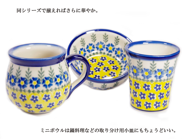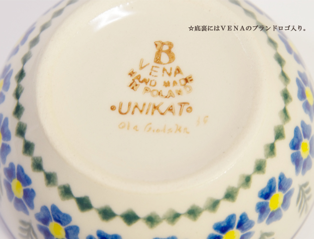 温かみを感じる陶器 ポーリッシュポタリーのボウルがポーランドから届きました。芸術的な装飾を得意とするVENA(ヴェナ)社の美しいボウルです。ぱっと明るい元気の出る黄色と美しい青いお花。そこにグリーンのボタニカル模様がデザインされた可愛くて楽しいデザインです。ボウルの大きさは直径約10cm程度。ティータイムではお菓子を入れたり、お料理の小鉢として、小さ目のサラダボウルやシリアルボウルにも。幅広い用途で使える万能ボウルです。ポットの裏にはVEVA(ヴェナ)社のロゴが入っているので、贈り物にも最適です。お揃いのマグカップや、ワインカップと一緒にプレゼントすればさらに喜ばれること間違いなしです。お誕生日プレゼントの他にもお引越し祝いや結婚祝いにも喜ばれるアイテムです。