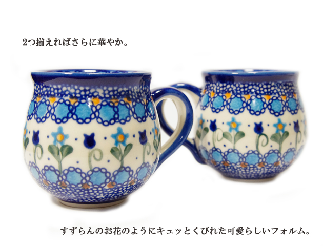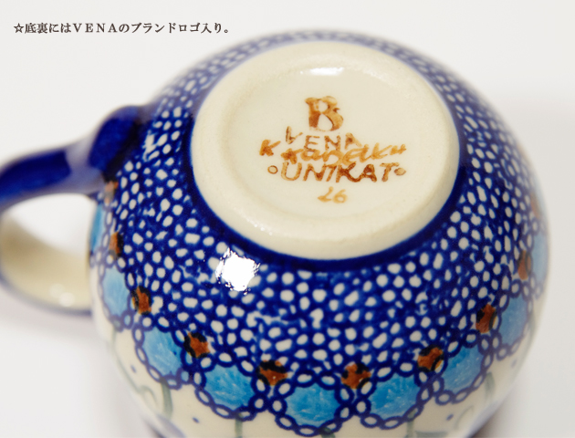 温かみを感じる陶器 ポーリッシュポタリーのマグカップがポーランドから届きました。芸術的な装飾を得意とするVENA(ヴェナ)社の美しいマグカップ。ポーリッシュポタリーらしい飲み口の下がくびれて丸みのあるフォルム。この形状はポーリッシュポタリー陶器のなかでもダントツの人気。美しいブルーを基調としたデザイン。小花とチューリップがユラユラと楽しそうに踊っているような雰囲気です。こんな可愛いマグカップでお茶したらいつものティータイムがもっと楽しくなりそうです♪カップの裏にはVEVA(ヴェナ)社のロゴが入っているので、贈り物にも最適です。お誕生日プレゼントの他にもお引越し祝いや結婚祝いにも喜ばれるアイテムです。