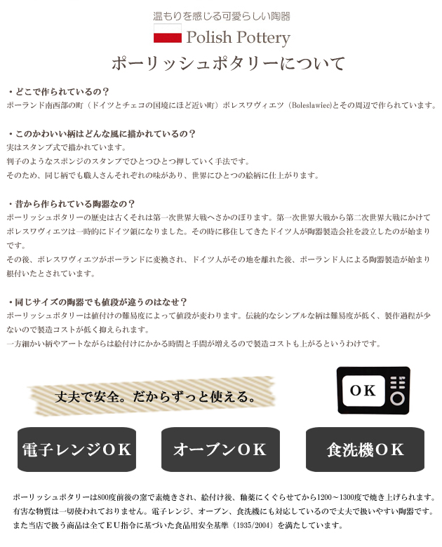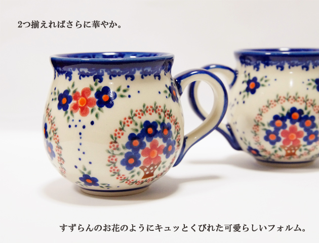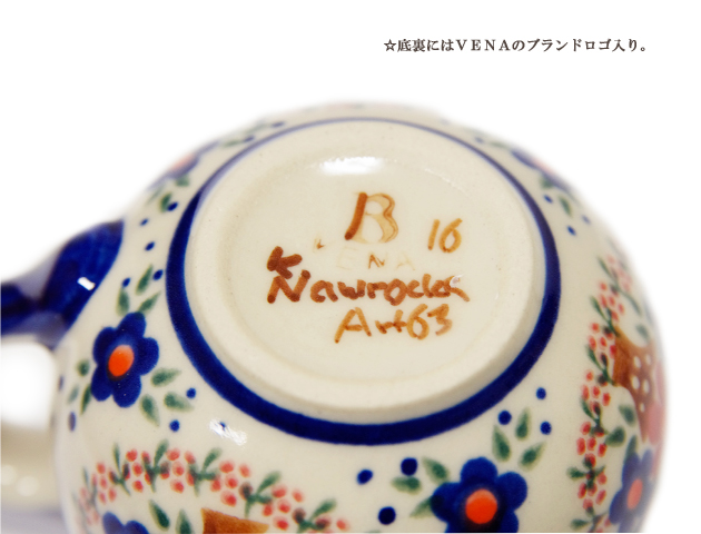 温かみを感じる陶器 ポーリッシュポタリーのマグカップがポーランドから届きました。芸術的な装飾を得意とするVENA(ヴェナ)社の美しいマグカップ。ポーリッシュポタリーらしい飲み口の下がくびれて丸みのあるフォルム。この形状はポーリッシュポタリー陶器のなかでもダントツの人気。VENA社デザイナーのEWA・Walczak(エヴァ・ヴァルチャック)さんがバロックをイメージしたという意匠。濃紺の縁取りの部分や絵柄の配置にバロック的な要素が伺える完成度の高い図案で、世界的にも人気のあるデザインです。モティーフとなっている愛らしい花かご(ブーケ)と、引き締まった印象を与える寒色とのバランスが絶妙です。こんな可愛いマグカップでお茶したらいつものティータイムがもっと楽しくなりそうです♪カップの裏にはVEVA(ヴェナ)社のロゴが入っているので、贈り物にも最適です。お揃いのボウルと一緒にプレゼントすればさらに喜ばれること間違いなしです。お誕生日プレゼントの他にもお引越し祝いや結婚祝いにも喜ばれるアイテムです。