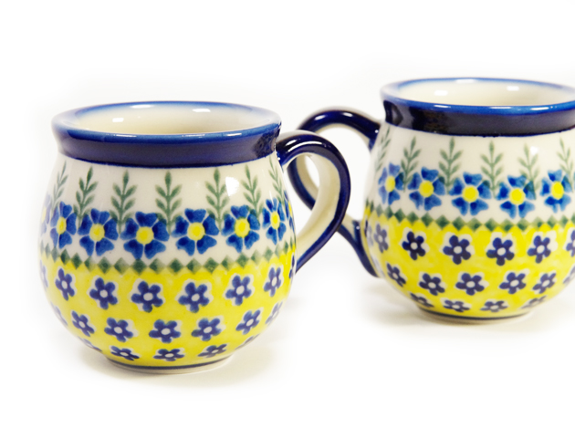 温かみを感じる陶器 ポーリッシュポタリーのマグカップがポーランドから届きました。芸術的な装飾を得意とするVENA(ヴェナ)社の美しいマグカップ。ポーリッシュポタリーらしい飲み口の下がくびれて丸みのあるフォルム。この形状はポーリッシュポタリー陶器のなかでもダントツの人気。ぱっと明るい元気の出る黄色と美しい青いお花。そこにグリーンのボタニカル模様がデザインされた可愛くて楽しいデザインです。こんな可愛いマグカップでお茶したらいつものティータイムがもっと楽しくなりそうです♪カップの裏にはVEVA(ヴェナ)社のロゴが入っているので、贈り物にも最適です。お揃いのボウルやワインカップと一緒にプレゼントすればさらに喜ばれること間違いなしです。お誕生日プレゼントの他にもお引越し祝いや結婚祝いにも喜ばれるアイテムです。