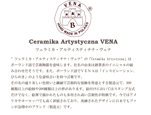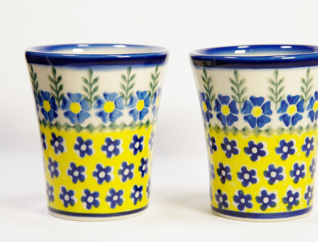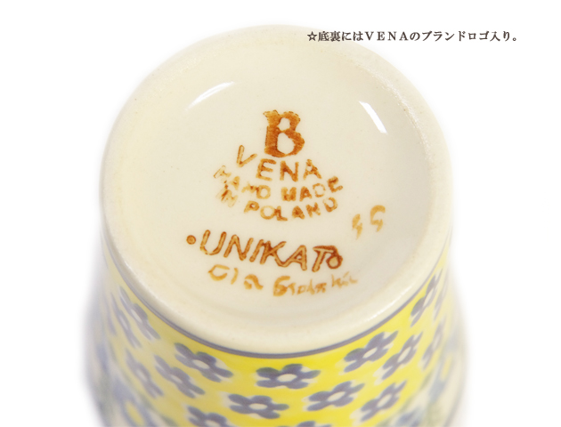 温かみを感じる陶器 ポーリッシュポタリーのワインカップがポーランドから届きました。芸術的な装飾を得意とするVENA(ヴェナ)社の美しいワインカップ。ぱっと明るい元気の出る黄色と美しい青いお花。そこにグリーンのボタニカル模様がデザインされた可愛くて楽しいデザインです。ワイン以外にも焼酎や日本酒にも合います。レンジも使用可能ですので、ホットワインや熱燗にも。ポーリッシュポタリーでお酒を楽しめるなんて♪いつもの晩酌がもっと楽しくなりそうです♪カップの裏にはVEVA(ヴェナ)社のロゴが入っているので、贈り物にも最適です。お揃いのマグカップやボウルと一緒にプレゼントすればさらに喜ばれること間違いなしです。お誕生日プレゼントの他にもお引越し祝いや結婚祝いにも喜ばれるアイテムです。