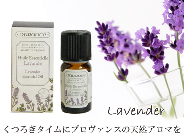 フランス デュランス社のエッセンシャルアロマオイル ラベンダーです。100%ピュアなデュランスエッセンシャルオイル(精油)です。ディフューザーやアロマポットで香りを拡散させたり、ナチュラルマッサージオイルに混ぜ希釈したトリートメントオイルで身体をマッサージしたり、バスタブに数滴垂らしてアロマバスをお楽しみいただけます。 デュランス社はフランス・プロバンス地方のグリニャン城を見下ろす広大な敷地にラベンダー等の畑とオフィス・工場を所有し、製品の製造・販売を行っています。「製品に使用するエッセンス、香料はできる限り自社の畑で有機栽培し、その他の香料も厳選された物のみを使用する」というのがポリシー。デュランス社は大地の恵みを豊かに取り入れた、プロヴァンスの香りを届けるトップブランドの一つです。